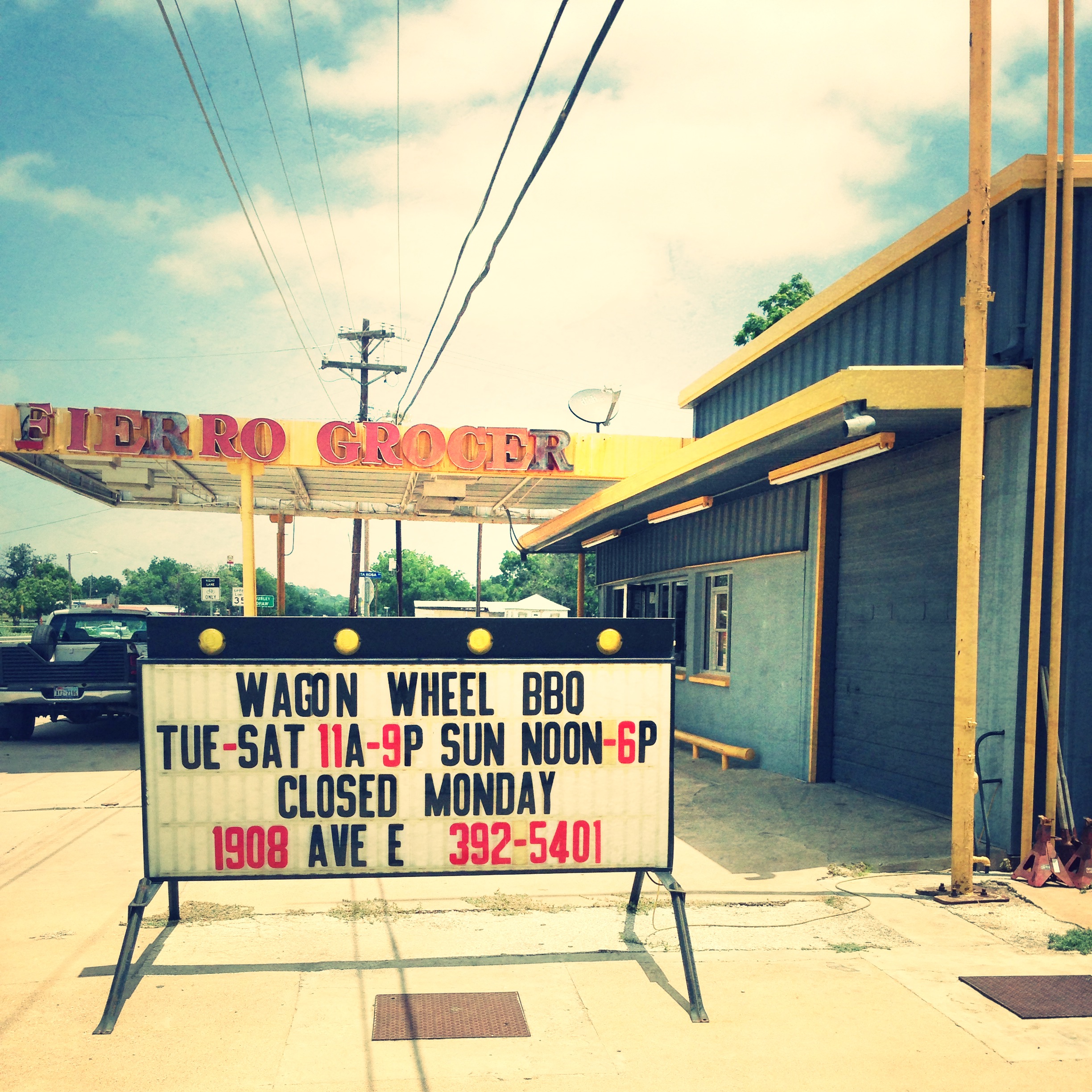 Having just seen the movie Chef, in which we had no idea they were going to be taking our exact same road trip in the opposite direction – cue baffled looks at one another here – we HAD to get ourselves some brisket. So thanks to the help of Yelp!, we found Wagon Wheel BBQ in Ozona, TX. We missed it the first time we drove past, and when we walked in, it turns out it’s pretty much an old gas station converted into a restaurant (sort of) in the front and a house in the back. They served us out of crock pots that had been simmering all day, and I filled up my own sweet tea from a drink dispenser by the door.