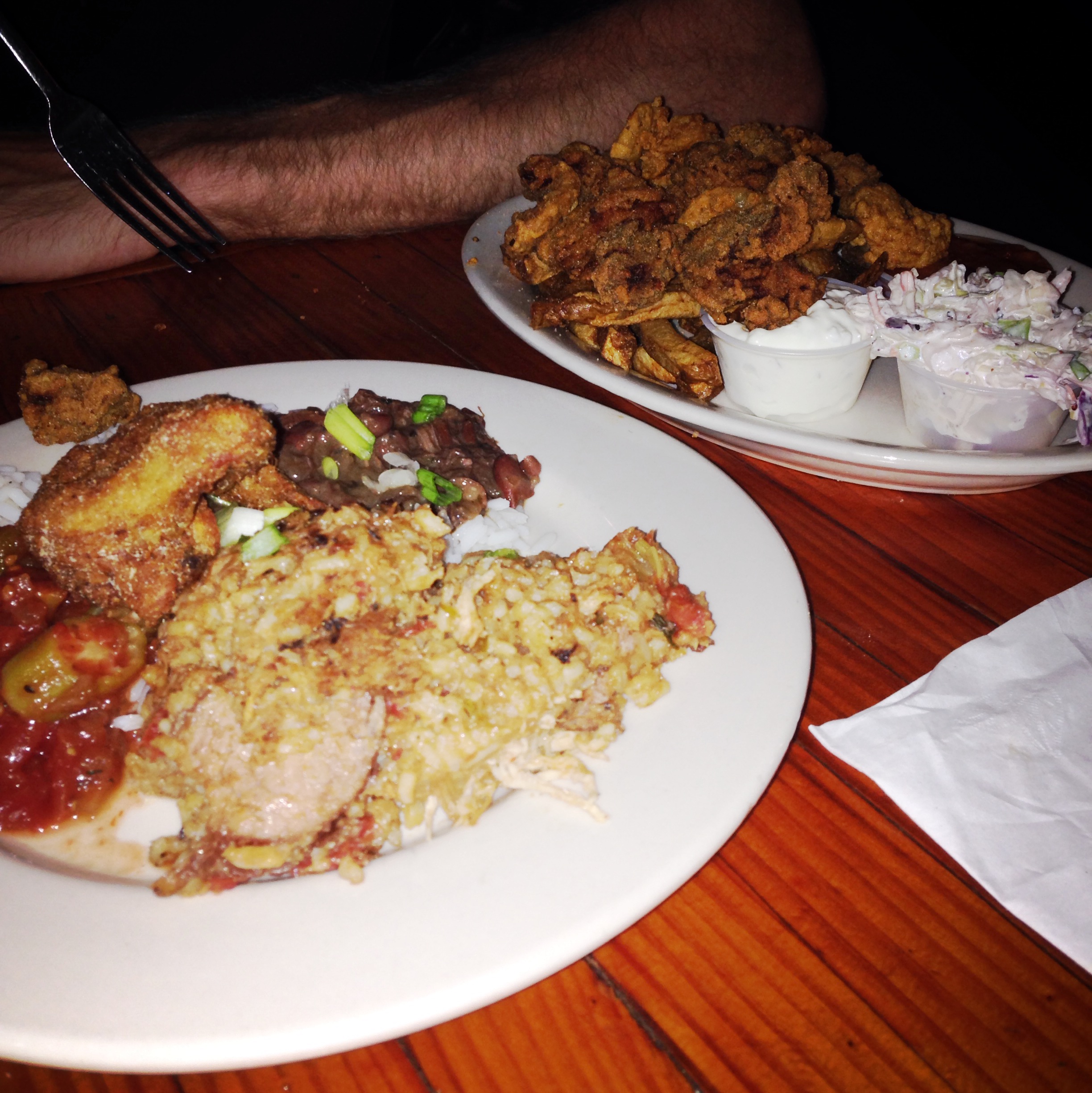 We wanted to try everything, so we ended up with a Coop’s Taste Plate and the Fried Oyster Dinner Plate. It’s a good thing the lighting wasn’t great, because the first dish out? Seafood gumbo. We had no idea it looked like this until we looked at the picture a while later… But oh my, was it good.