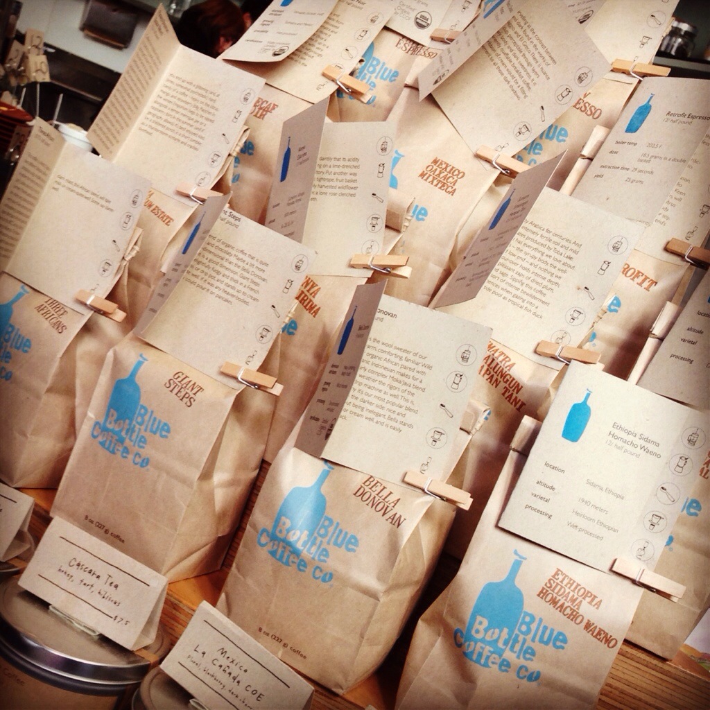 So since coffee is such a integral part of treating myself when on vacation, shitty hotel coffee just would not do. Yelp-ing nearby coffee shops lead to the exciting discovery of Blue Bottle Coffee Co., which with 1264 reviews yielding a solid four-star rating, I was not going to let myself miss out on. Since Bill does not enjoy coffee in the least and was feeling more or less, um, under the weather – which may or may not have had anything to do with the shenanigans from the night before – I ventured out on my own in search of not-your-average caffeine fix. However, following my maps app left me stumped. I wandered and wandered Mint Street in search of some visual indication that I was in the right place, but nothing jumped out. Disappointed, I turned back toward the way I came for the third time, and the first thing to catch my eye was the street address. And around the corner from the street address was a small group of people huddled in a doorway. And above the doorway, I saw the only marking indicating that roasted bliss was waiting for me was the small (the picture make it look huge) sign serving as their advertising. Small, unmarked, back-alley coffee shop? That had mean only one thing: local secret hidden gem.