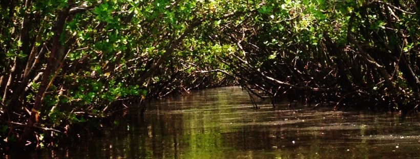 It looked as if we made the right decision, especially gliding through the calm waters into the gorgeous lagoon. Looks pretty friendly to me.IMG_6140Arriving in the lagoon, fish were jumping everywhere, and I immediately spotted a giant egret poised up in the trees. On the other side, however, the passageway she had described was nowhere to be found, and we seemed to have reached a dead end. This is when, as if on cue, the woman came into the lagoon and called out, in complete smug seriousness, “I’ll show you the way for 50 bucks.” She tricked us, the witch. But just then, I spotted a small pink ribbon hanging from a tree in the distance, which our original guide had briefly mentioned marked the way for kayakers. As we headed towards it she disappointedly yelled that we were right on the money, and although I was nervous heading into the small covered mangrove tunnel, I was sure it couldn’t have been that bad, right? WRONG.
