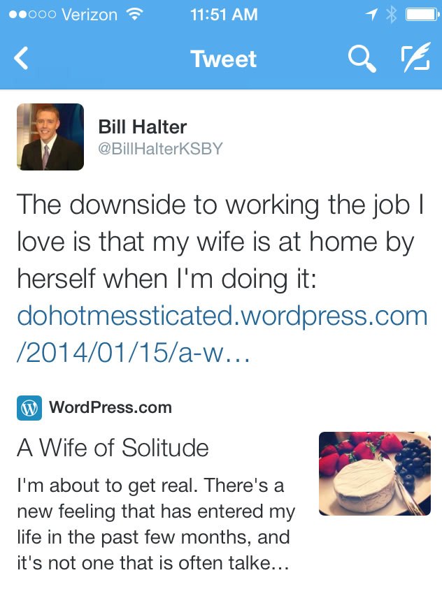 A week or two ago, I contacted one of my blogging idols, Jordan Reid of Ramshackle Glam, with a question. After receiving such an amazing response to my Wife of Solitude post, I wanted to reach out to one of the most inspiring women I’ve come to admire and who I know has experienced very similar things with her husband Kendrick heading back to grad school. She responded with the most poignant of emails, and it was so helpful. So incredibly helpful, in fact, that I found myself holding back tears at my desk. I expected her to relate and understand, of course. But what I didn’t expect the extent to which she actually did – just as I hadn’t expected so many of my strong, loving and vibrant friends to confess similar feelings to me. It was a strange experience laying my feelings out on the table like that, especially since Bill was so supportive and receptive to my public exposure of a personal struggle of our shared married life that he even retweeted the post to his local followers: